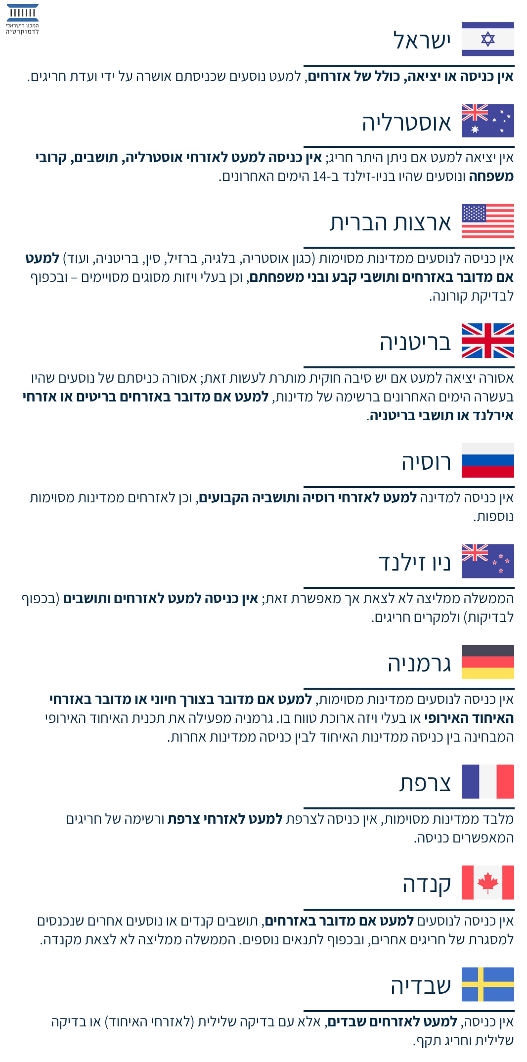 בבדיקה מיוחדת שערך המכון הישראלי לדמוקרטיה עולה כי מרבית המדינות בעולם לא אסרו באופן גורף את כניסת אזרחיהן לשטחי המדינה וכי האיסור הישראלי חריג למדיי. כך למשל- אוסטרליה, ארה"ב, בריטניה, צרפת, קנדה, רוסיה, שבדיה ואפילו ניו זילנד מאפשרות לאזרחיהן להיכנס למדינה, גם בימים אלה.