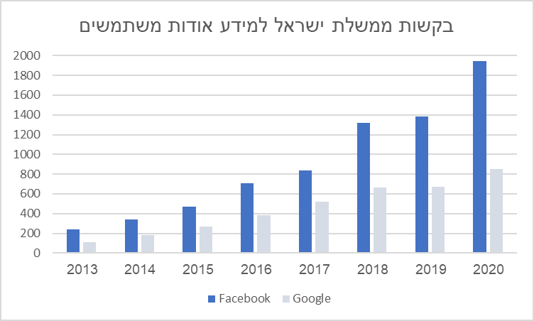 מקור: דוחות השקיפות של חברות גוגל ומטא.עבור חב' מטא ר' https://transparency.fb.com/data/government-data-requests/; עבור חב' גוגל ר' https://transparencyreport.google.com/user-data/overview?hl=en. יצויין כי לחברת אמזון אין נתונים אודות ישראל. חברת אפל מדווחת על מספר בקשות נמוך מדי שנה (למטה מ-10).