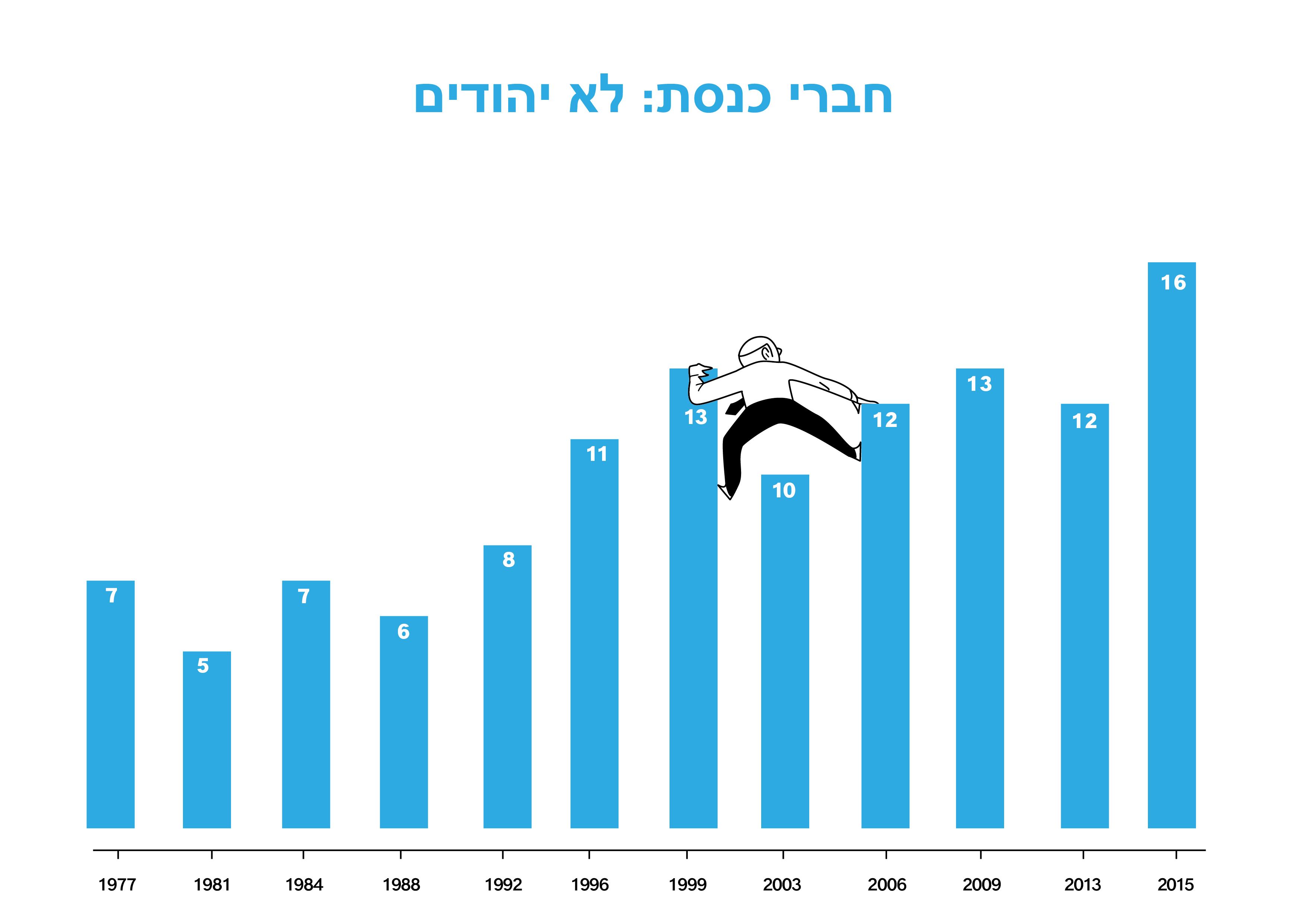 גידול בולט בייצוג של קבוצת אוכלוסייה נוספת בבית הנבחרים הישראלי הוא של המגזר הלא-יהודי (ערבים ודרוזים). מספרם של חברי הכנסת הלא-יהודים היה מצומצם למדי עד לשנות התשעים ומאז נמצא במגמת עלייה וכיום – בנקודת שיא של 16. ההסבר לגידול זה נובע בעיקרו במעבר של האוכלוסייה הערבית להצביע לרשימות סקטוריאליות ערביות כגון רע"מ-תע"ל ובל"ד. בכנסת הנוכחית מיוצגים 12 חברי כנסת לא-יהודים במסגרת הרשימה המשותפת – המאגדת את שלוש המפלגות הערביות ואת חד"ש. ארבעת הנותרים מיוצגים בליכוד, במחנה הציוני, בישראל ביתנו ובמרצ. יש לומר שעל אף הגידול במספר חברי הכּנסת הלא-יהודים, מספרם עדיין לא משקף את חלקם היחסי בחברה הישראלית, העומד על כ-20%.