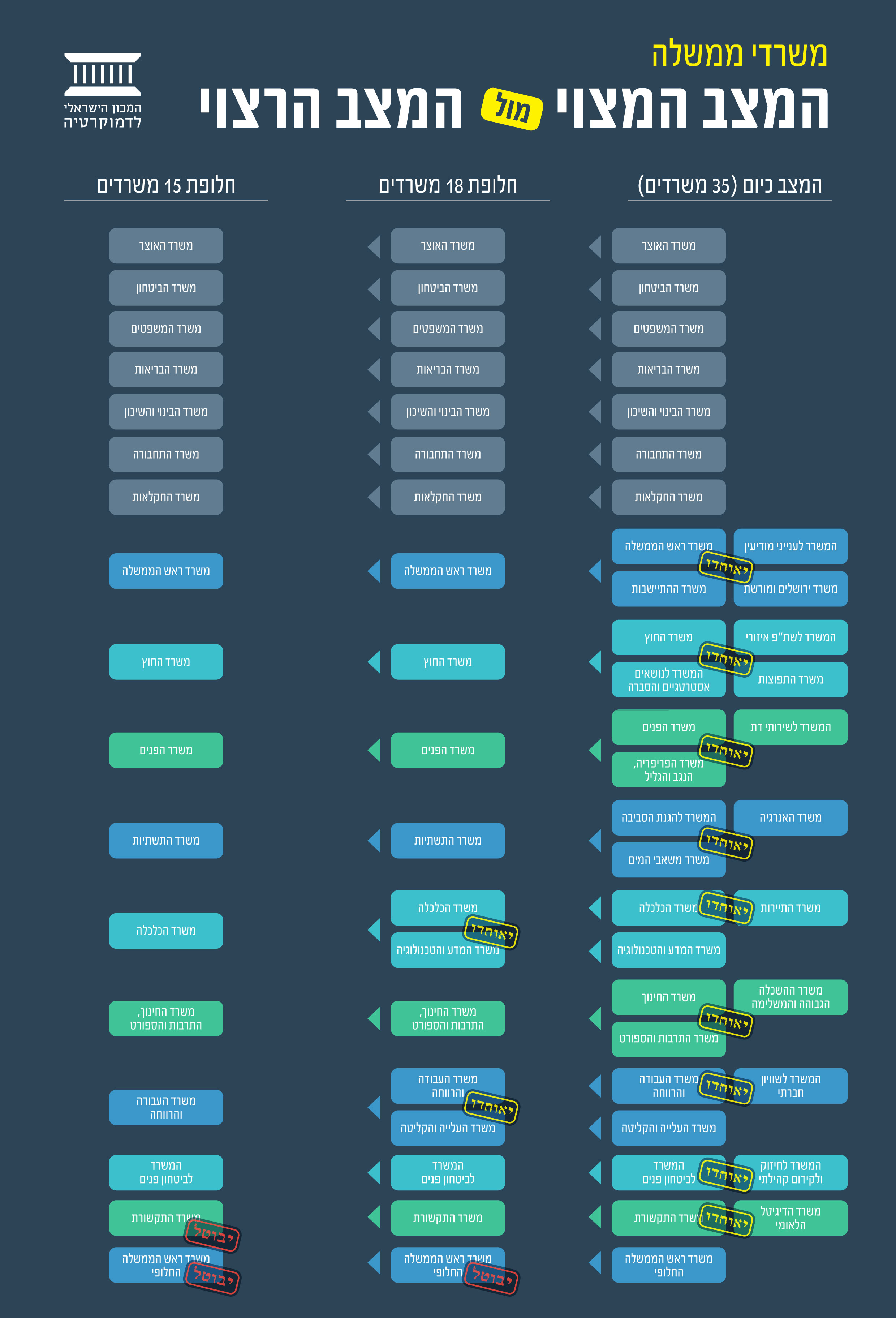על רקע המגעים לממשלת אחדות, חשוב לקרוא למקבלי ההחלטות לאמץ מתווה שיביא לצמצום מספר המשרדים, ובכך לייעל את הליכי קבלת ההחלטות לחסוך בכספי ציבור, ולחזק את יכולת המשילות. גם ביחס למדינות דמוקרטיות הדומות לנו מבחינת גודל האוכלוסייה - המספר המסתמן של משרדי הממשלה בישראל קיצוני וחריג