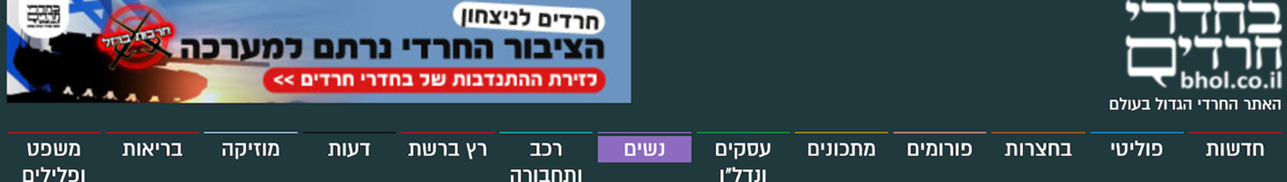 המרחב הישראלי – הייצוג הוויזואלי הברור ביותר של המרחב הישראלי הוא הלוגו המתחלף של ״כיכר השבת״. הלוגו המוכר, ״כיכר השבת״, אדום-לבן על רקע שחור, מתחלף לדגל ישראל דיגיטלי המתנפנף ברוח, עם הכיתוב ״באמונה ובאחדות״. לרגע לא האמנתי - דגל ישראל? בסמליל של אתר חדשות חרדי? אפילו הכיתוב ״באמונה ובאחדות״ נבחר בקפידה. האמונה לא חייבת להיות רק בא-ל, אלא יכולה להיות גם בצדקת הדרך. הביטוי ״באחדות״ מדגיש בעיני, יותר מכל, את הרצון של החברה החרדית (או לפחות של אנשי הדיגיטל של ״כיכר השבת״) להרגיש חלק אחד, מאוחד, מעם ישראל ומהמדינה. "בחדרי חרדים" לא שינו את הלוגו, אבל הצמידו אליו את ״חרדים לניצחון – הציבור החרדי נרתם למערכה – זירת ההתנדבות של בחדרי חרדים״.