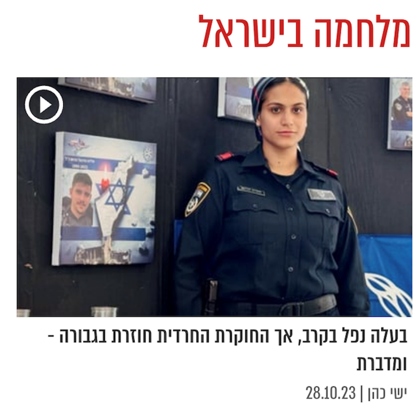 בכיכר השבת יש נוכחות מרשימה (יחסית) של נשים מגויסות, כולל סרטונים ותמונות. סרטון – ״הקצינה שנלחמה מול המחבלים בשדרות בשחזור דרמטי״, (26.10.23) וראיון עם חוקרת משטרה חרדית – ״בעלה נפל בקרב, אך החוקרת החרדית חוזרת בגבורה״ (28.10.23)