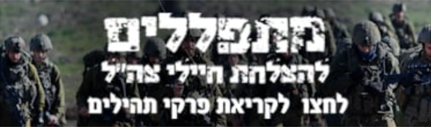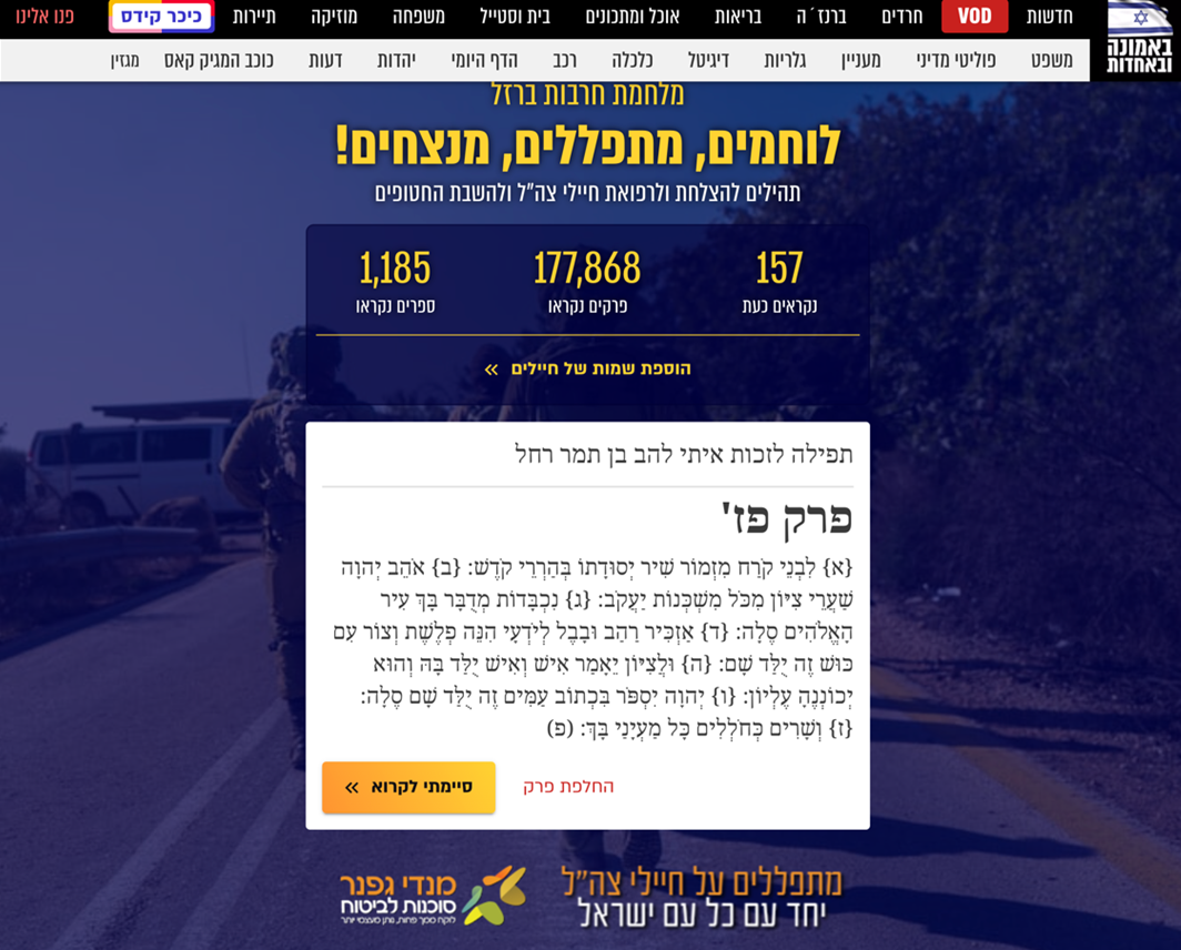 המרחב המעורב – במרחב זה אני ממקמת טקסטים שמדגישים את הערכים העליונים של החברה החרדית – לימוד תורה, אמונה ותפילה – ואת הקשר שלהם למצב החירום. הקישור ״מתפללים להצלחת חיילי צה״ל: לחצו לקריאת פרקי תהילים״ באתר כיכר השבת מכיל תמונה של חיילים עם ציוד מלא, צועדים במרחב ירוק. הוא מוביל למערכת דיגיטלית המונה את מספר הפרקים והספרים שנקראו ונקראים כעת. המערכת מתהדרת בכותרת: ״מלחמת חרבות ברזל – לוחמים, מתפללים, מנצחים!״ ובאותיות קטנות יותר: תהילים להצלחת ולרפואת חיילי צה״ל ולהשבת החטופים. בעוד הקישור ״מתפללים להצלחת חיילי צה״ל״ מפריד בין המתפללים (אנחנו, החרדים) שמתפללים להצלחת ה-הם (חיילי צה״ל), המערכת הדיגיטלית כוללת את כולם ביחד – לוחמים, מתפללים, מנצחים! הן הלוחמים והן המתפללים מובילים לניצחון.
