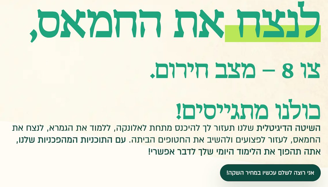 קישור אחר, שכותרתו ״צו 8 – מצב חירום״ מוביל לפרסומת לאפליקציה ללימוד גמרא. 90% ההנחה על האפליקציה מקושטים בגופן ירוק-צבאי – ״לנצח את החמאס... כולנו מתגייסים!״