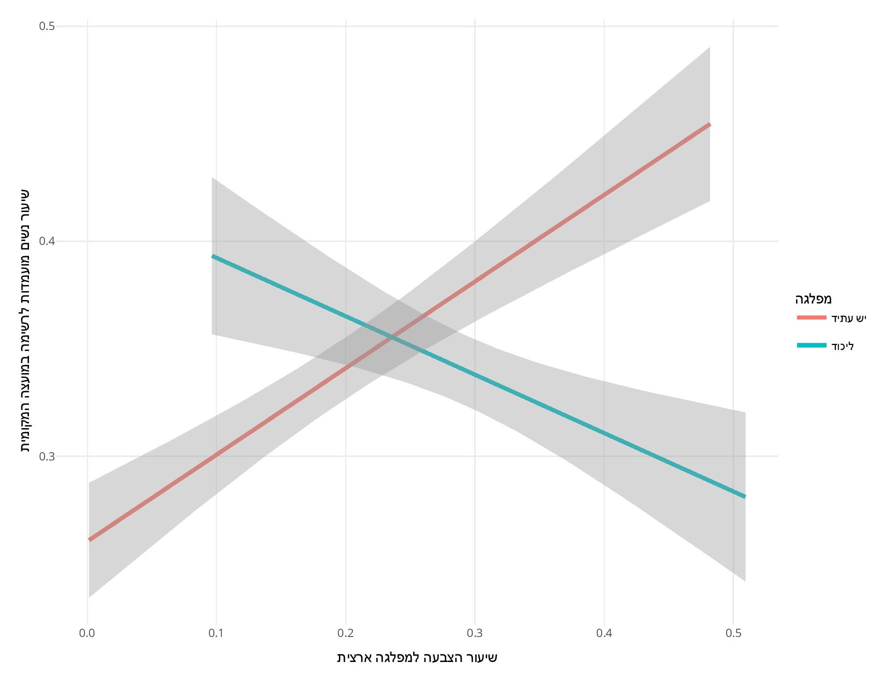 תרשים 12 מראה את שיעורי ההצבעה של תושבי הרשות בבחירות הארציות (ב-2022) לשתי המפלגות הגדולות, הליכוד ויש עתיד, ואת שיעור הנשים מבין המועמדות למועצה באותה רשות. ככל ששיעור המצביעים למפלגת יש עתיד ברשות (בבחירות הארציות) גבוה יותר – שיעור שהוא אינדיקציה לאוכלוסייה חילונית יותר וימנית פחות – שיעור הנשים מבין המועמדות למועצת הרשות גבוה יותר. לעומת זאת, ככל ששיעור המצביעים למפלגת הליכוד (בבחירות הארציות) גבוה יותר, שיעור הנשים מקרב המועמדים למועצה הולך ופוחת. כאמור, ההסבר לקשר זה יכול להיות הן מצד הביקוש של בוחרים להרכב מועמדים מגוון יותר מבחינה מגדרית, הן מצד ההיצע של מועמדים, כלומר, קיומה של קבוצת נשים גדולה מספיק המעורבת בפוליטיקה המקומית ושואפת להיבחר למועצת הרשות.