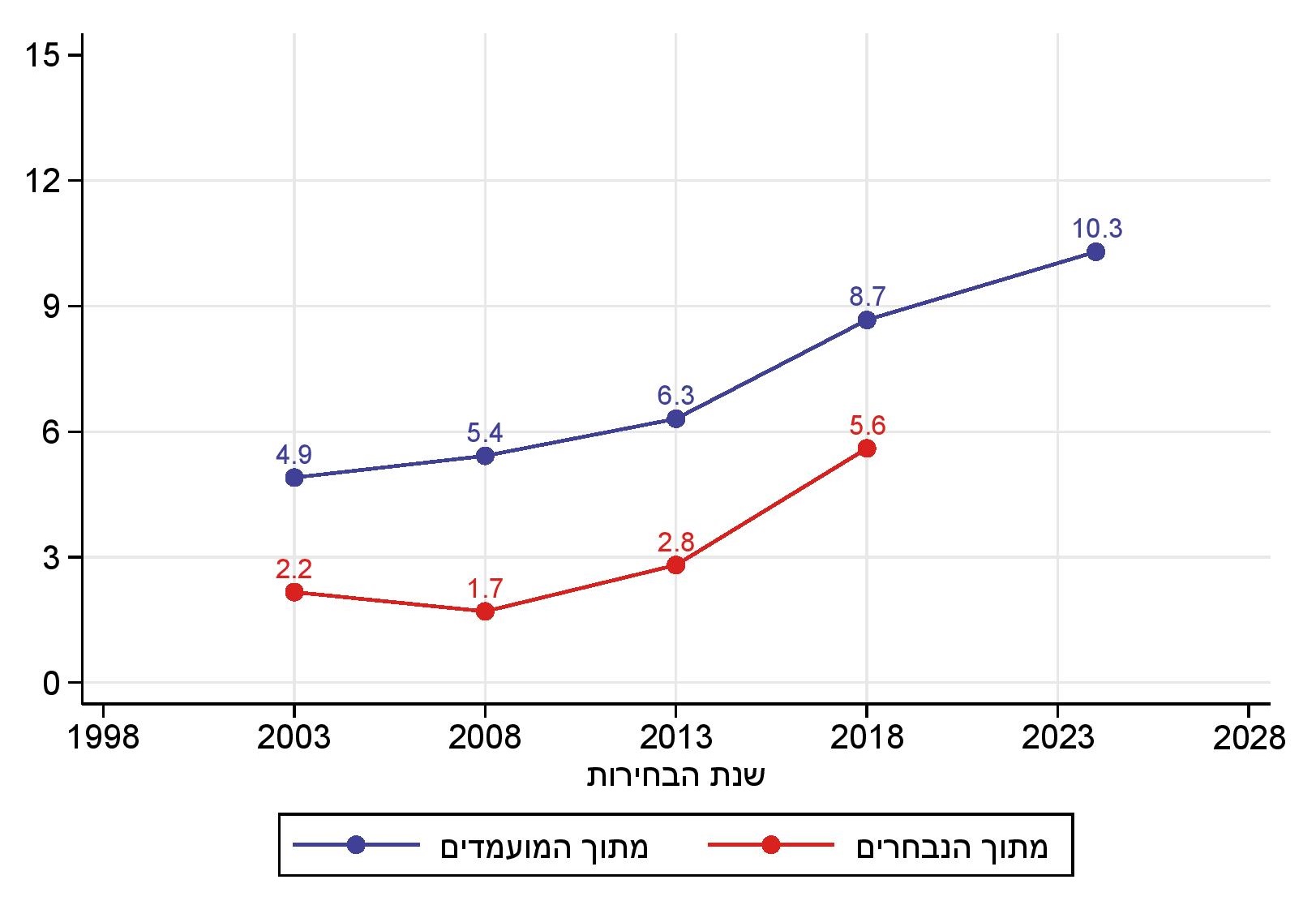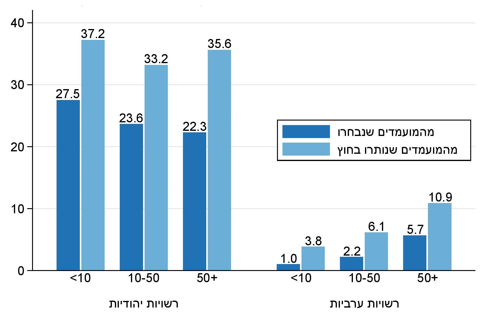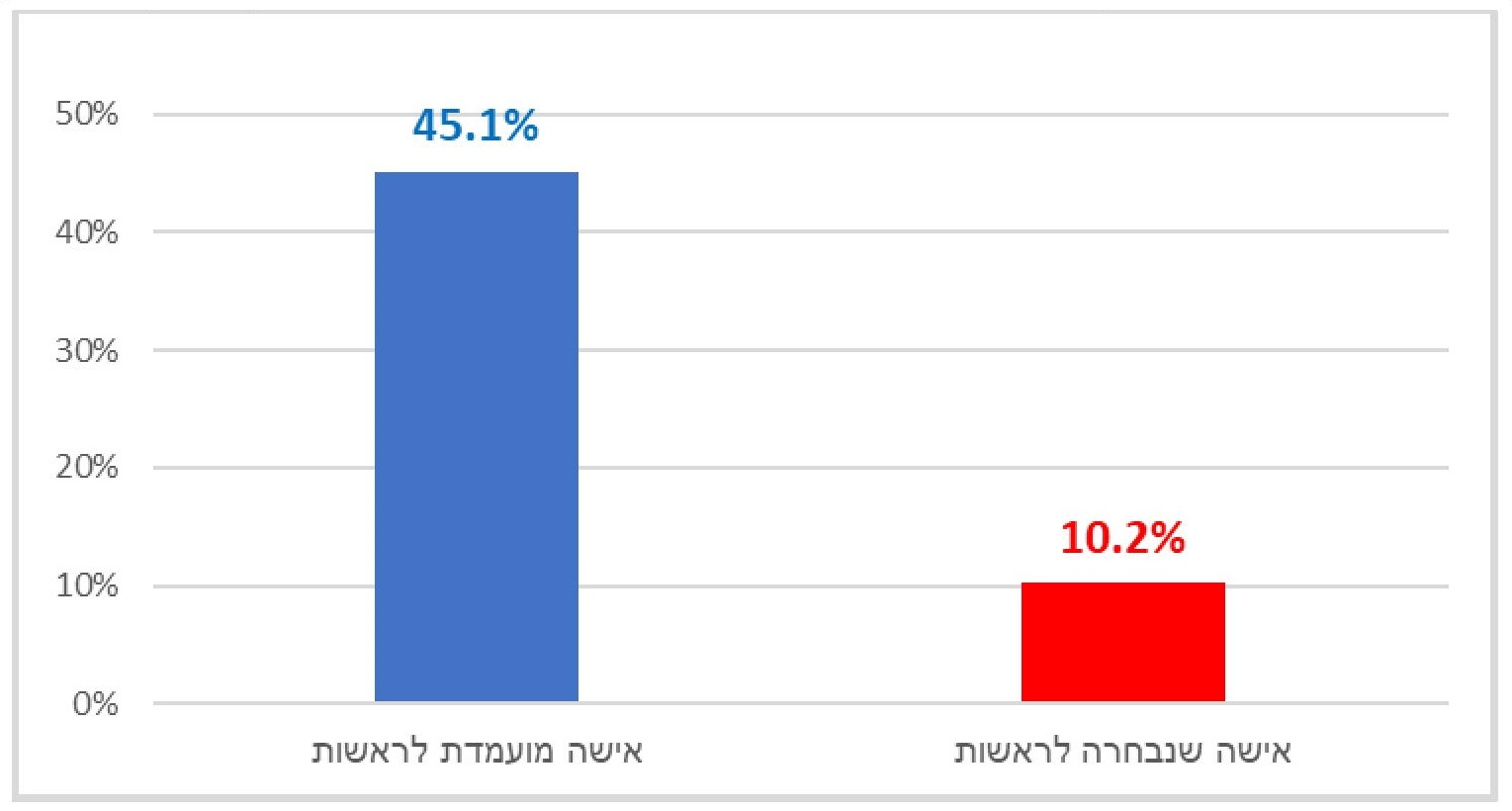 לבסוף, תרשים 4 מראה את שיעור הרשויות שבהן הייתה בארבעת סבבי הבחירות האחרונים, בין 2003 ל־2018, לפחות פעם אחת מועמדת לתפקיד ראש הרשות ומועמדת שנבחרה לראשות. הממצאים מלמדים שב־10% מהרשויות נבחרה לפחות פעם אחת אישה (נתון זה אינו כולל נשים שהחליפו מועמד מכהן במהלך קדנציה מבלי להיבחר). נוסף על כך, בכמעט מחצית מהרשויות הייתה באחד מהסבבים לכל הפחות אישה אחת מועמדת לראשות עיר, גם בלי להחריג מהחישוב את הרשויות הערביות.