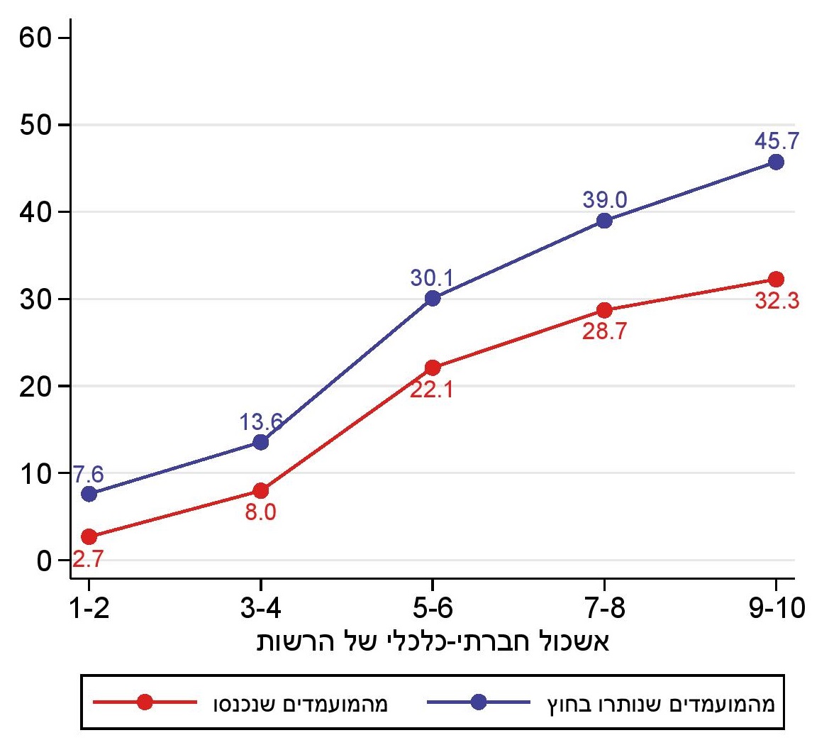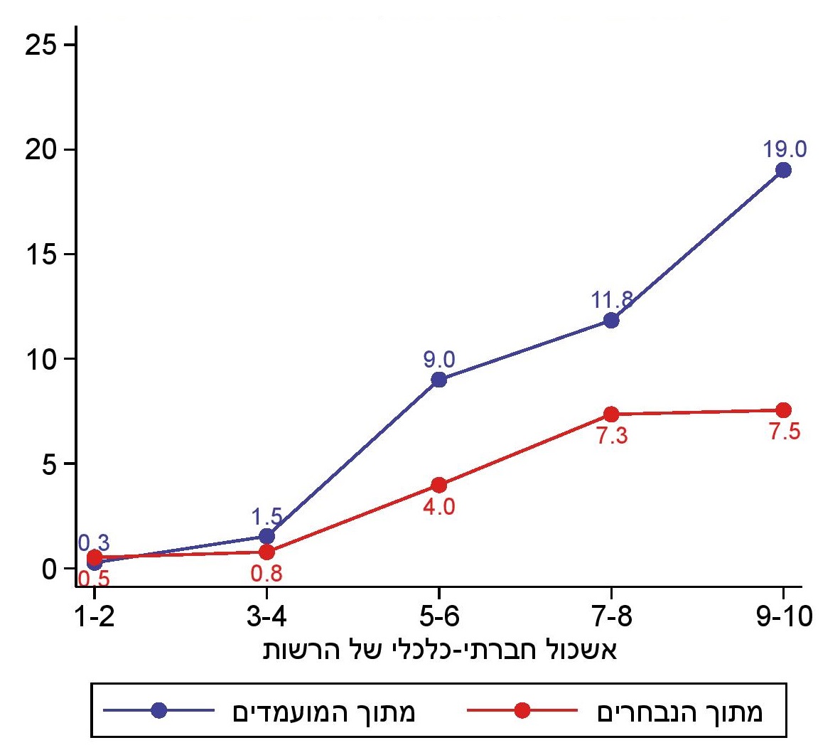 שיעור הנשים מבין המועמדים ומבין הנבחרים לראשות העיר גבוה יותר ברשויות חזקות מבחינה כלכלית (ראו תרשים 3). ניתן להסביר קשר זה תחילה בעובדה שבאשכולות החברתיים־כלכליים הנמוכים נמצאות כמעט כל הרשויות הערביות וכל הרשויות החרדיות. ברשויות האלה שיעור המועמדות לראשות העיר הוא אפסי, וגם שיעור הנשים בין המועמדים למועצה נמוך מאוד בהשוואה לרשויות היהודיות (ראו להלן). נוסף על כך, ככלל, ברשויות החזקות כלכלית יש שיעור גבוה יותר של מצביעי מרכז־שמאל, ושיעור זה סביר שישפיע על שיעור הנשים המועמדות, הן מצד הביקוש (של בוחרים), הן מצד ההיצע (של מועמדות פוטנציאליות). עם זאת, אין להתעלם מהעובדה שהניתוח כאן מבוסס על מספרים קטנים למדי, ומכאן שההסבר המוצע צריך להיבחן בזהירות. אכן, בעת כתיבת השורות האלה חלק מן הרשויות הגדולות ביותר שבראשן עומדת אישה הן דווקא ערים בעלות נטייה פוליטית ימנית ונטייה מסורתית, כמו נתניה (אשכול חברתי־כלכלי 6 בשנת 2017) ובית שמש (אשכול 2), וגם ירוחם (אשכול 3, קטנה באוכלוסייתה, אך בעלת נטייה ימנית ומסורתית).