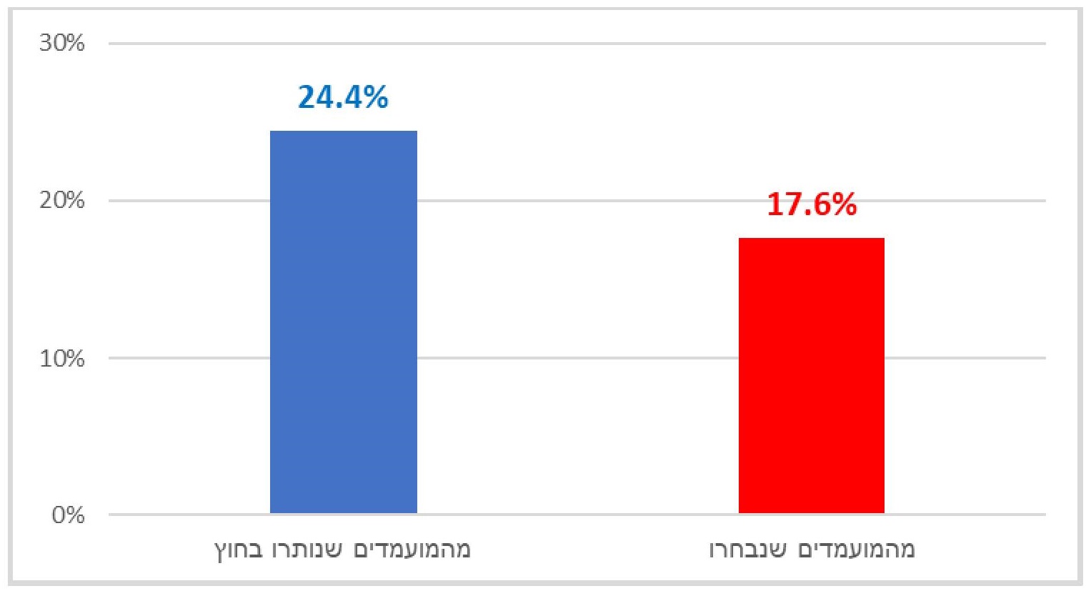 שיעור הנשים בקרב המועמדים והנבחרים למועצת הרשות בשנת 2018 (כאמור, השנה היחידה שעבורה יש בידינו נתוני המועמדים שלא נבחרו למועצה) שונה במידה משמעותית משיעורן בקרב המועמדות והנבחרות לתפקיד ראש הרשות – נשים הן כרבע מהמועמדים שלא נכנסו למועצה, ולמעלה משישית מהמועמדים שנכנסו למועצה (ראו תרשים 5).במקרה זה מוצג שיעור הנשים מתוך המועמדים שנכנסו למועצה ומתוך מי שלא נכנסו. בחרנו להימנע מהתייחסות לשיעורן בכלל המועמדים – כלומר, לפני ההיבחרות – משום שיש הבדל משמעותי בין מועמדים במקומות ריאליים לשאר המועמדים, ומשום שקשה לזהות מראש את המקומות הריאליים בכל רשימה ורשות.