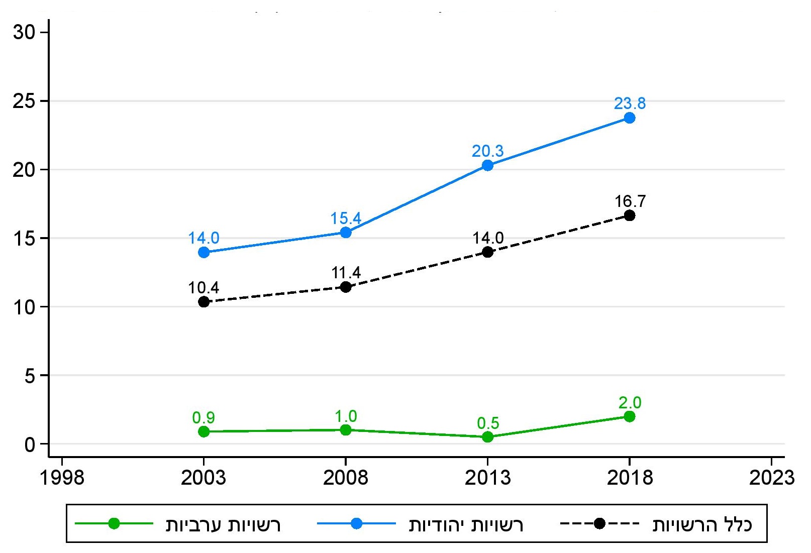 תרשים 2: שיעור הנשים במרוץ לראשות הרשות, רשויות יהודיות בלבד (ב־%)