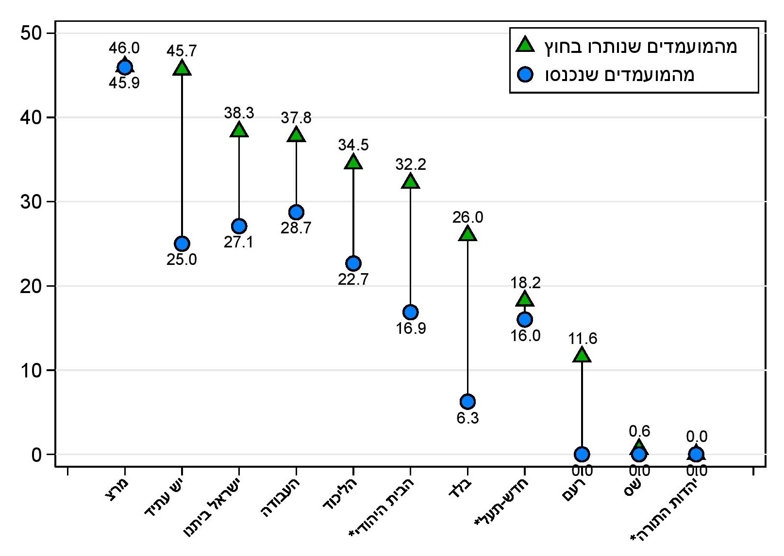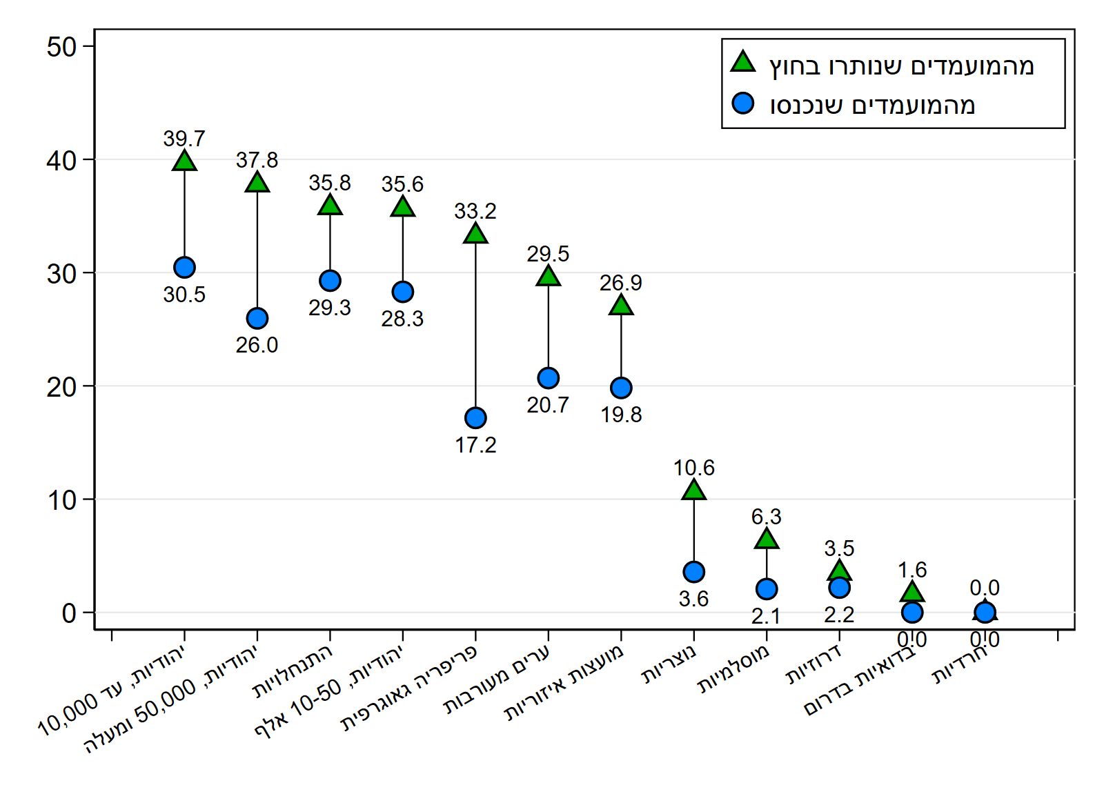 לבסוף, הראינו כי יש קשר בין שיעור הנשים לבין מאפיינים נוספים של הרשויות והרשימות למועצה. ככלל, בערים שבהן שיעור ההצבעה לשמאל גבוה יותר, וברשימות למועצה שיש להן זיקה למפלגות ארציות שמאליות יותר, נשים מתמודדות, וגם נבחרות, בשיעור גבוה יותר בהשוואה לשאר הערים והרשימות.