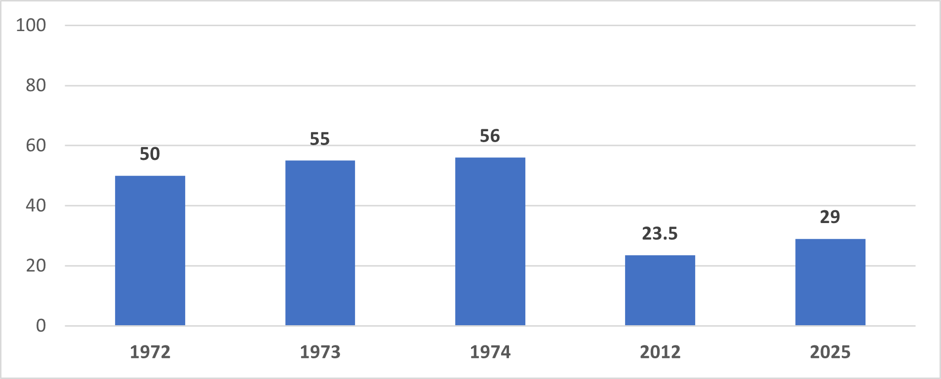 Support separation between Memorial Day and Independence Day 1972-2025 (Jews; %)