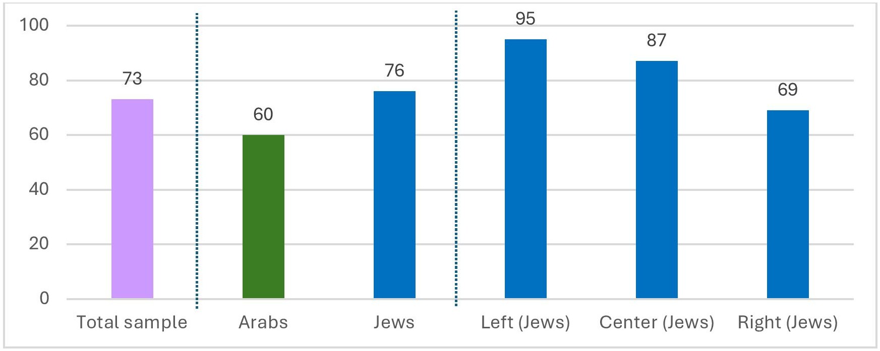 - A large majority of the public (74%) support establishing a state commission of inquiry to investigate the events of October 7 (Jews, 75.5%; Arabs, 68%).