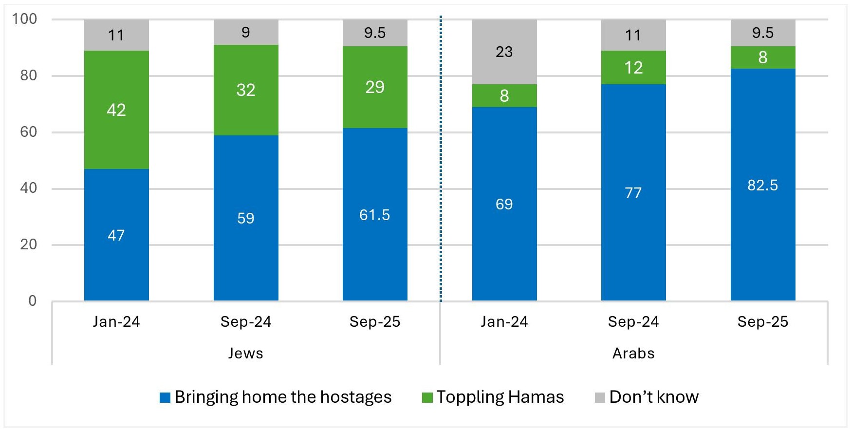 - The main goal of the war in Gaza today should be the bringing the hostages home, according to 65% of the total sample. The share of those who hold this view has risen steadily since January 2024, among both Jews and Arabs. In all surveys to date, a larger proportion of Arabs than of Jews think this should be the main goal.