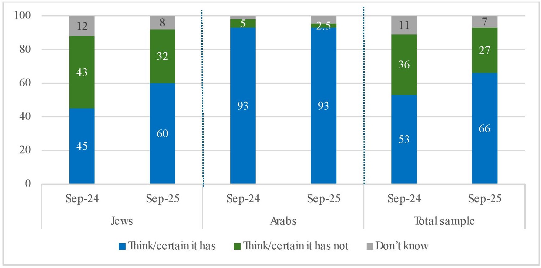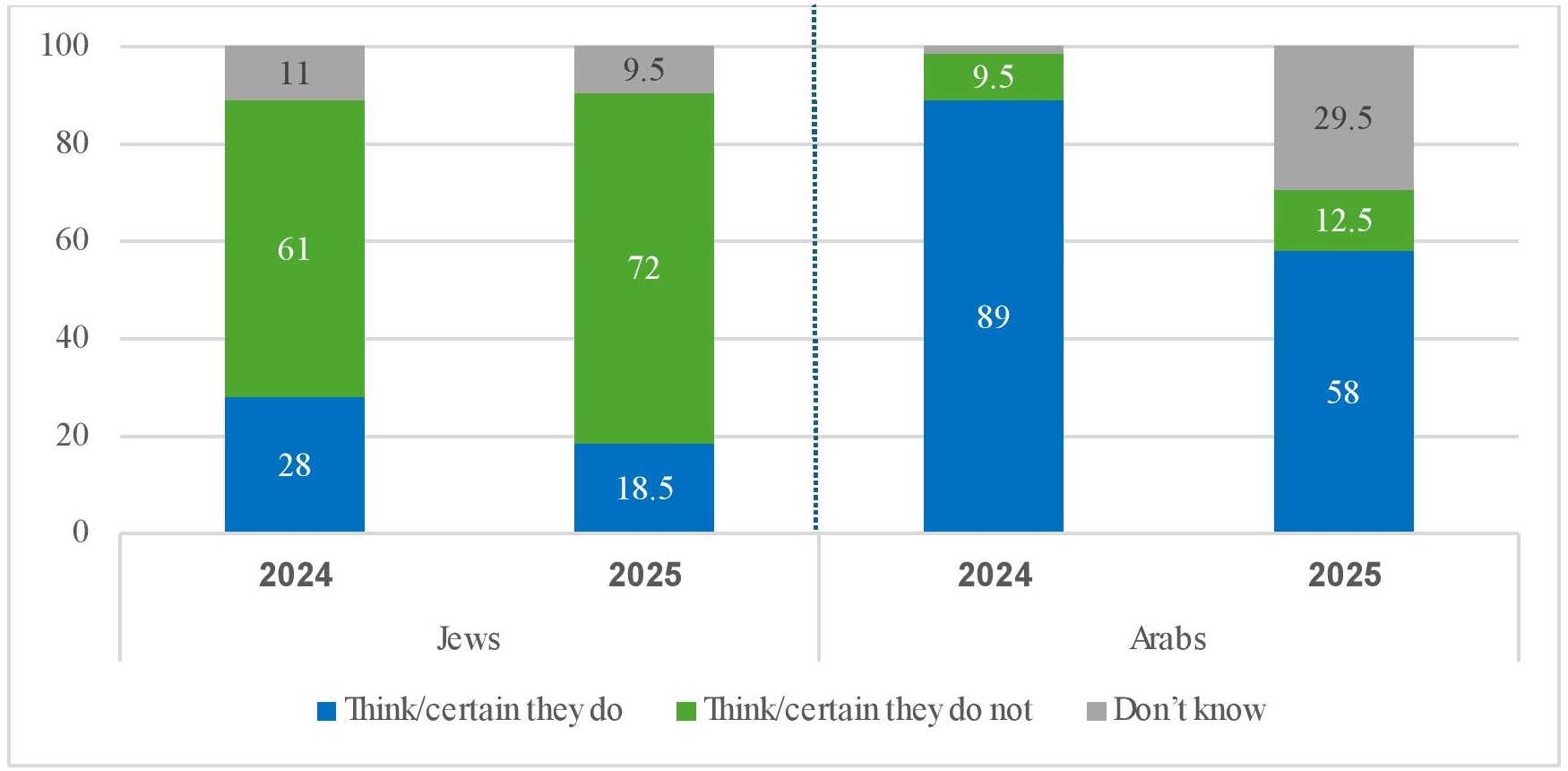 - Almost three-quarters of the Jewish public think that the Palestinian people do not have the right to a state of their own, an increase of 11 percentage points from last year.