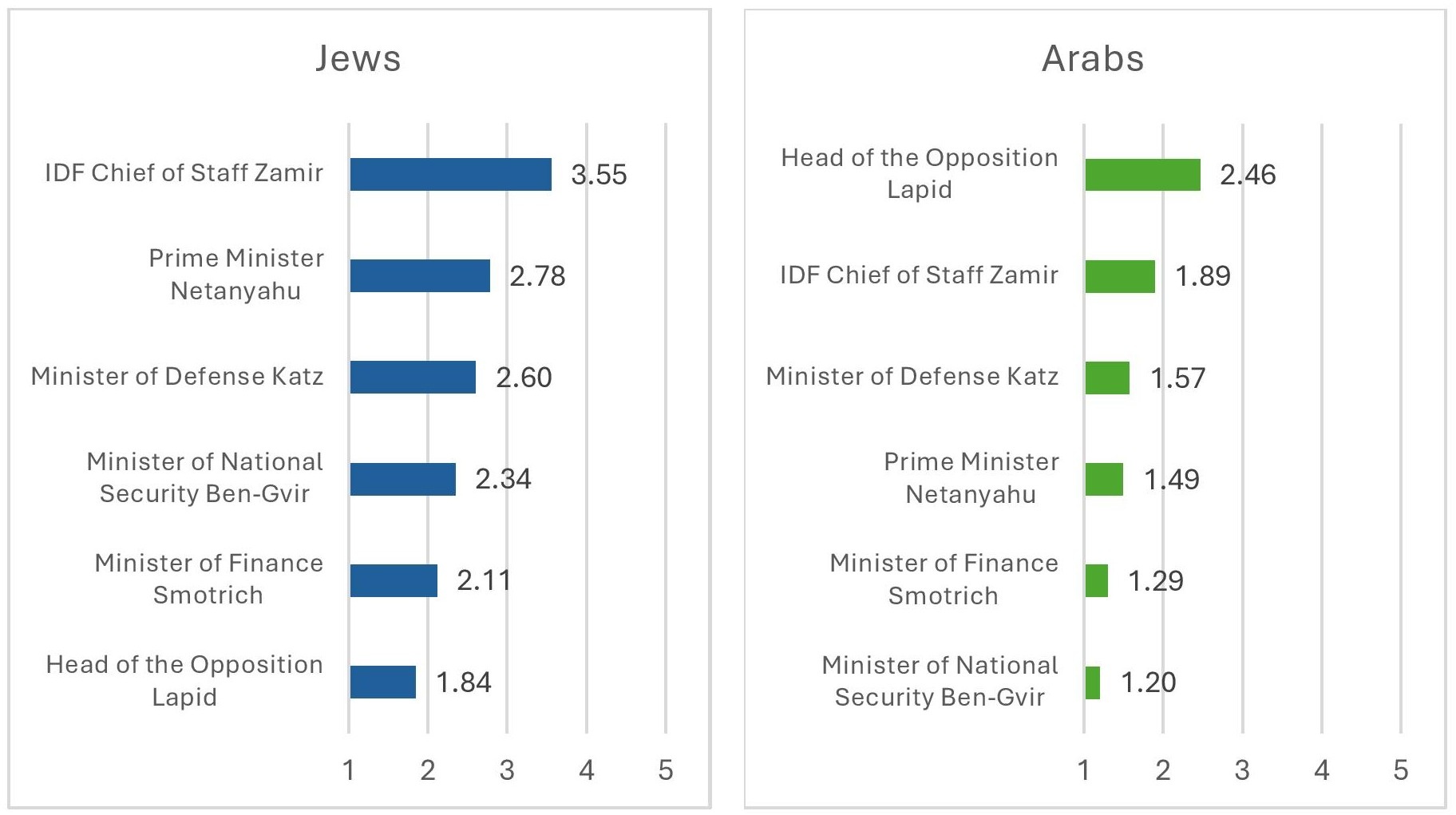 - All the officials we asked about, both in the government and outside of it, received performance ratings lower than the mid-point score (3), with the exception of the IDF chief of staff, who received a slightly higher average score (3.26 in the total sample, 3.55 among Jews, but only 1.89 among Arabs).