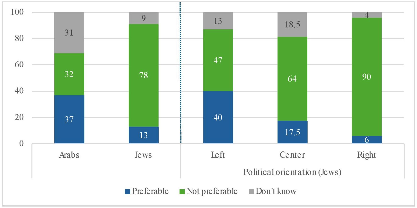 - In the Arab sample, the share of those who think Israel can accommodate the establishment of a Palestinian state is only slightly larger than the share who hold the opposite view (37% and 32%, respectively). As in the previous question, the proportion of “don’t know” responses is very high (31%).