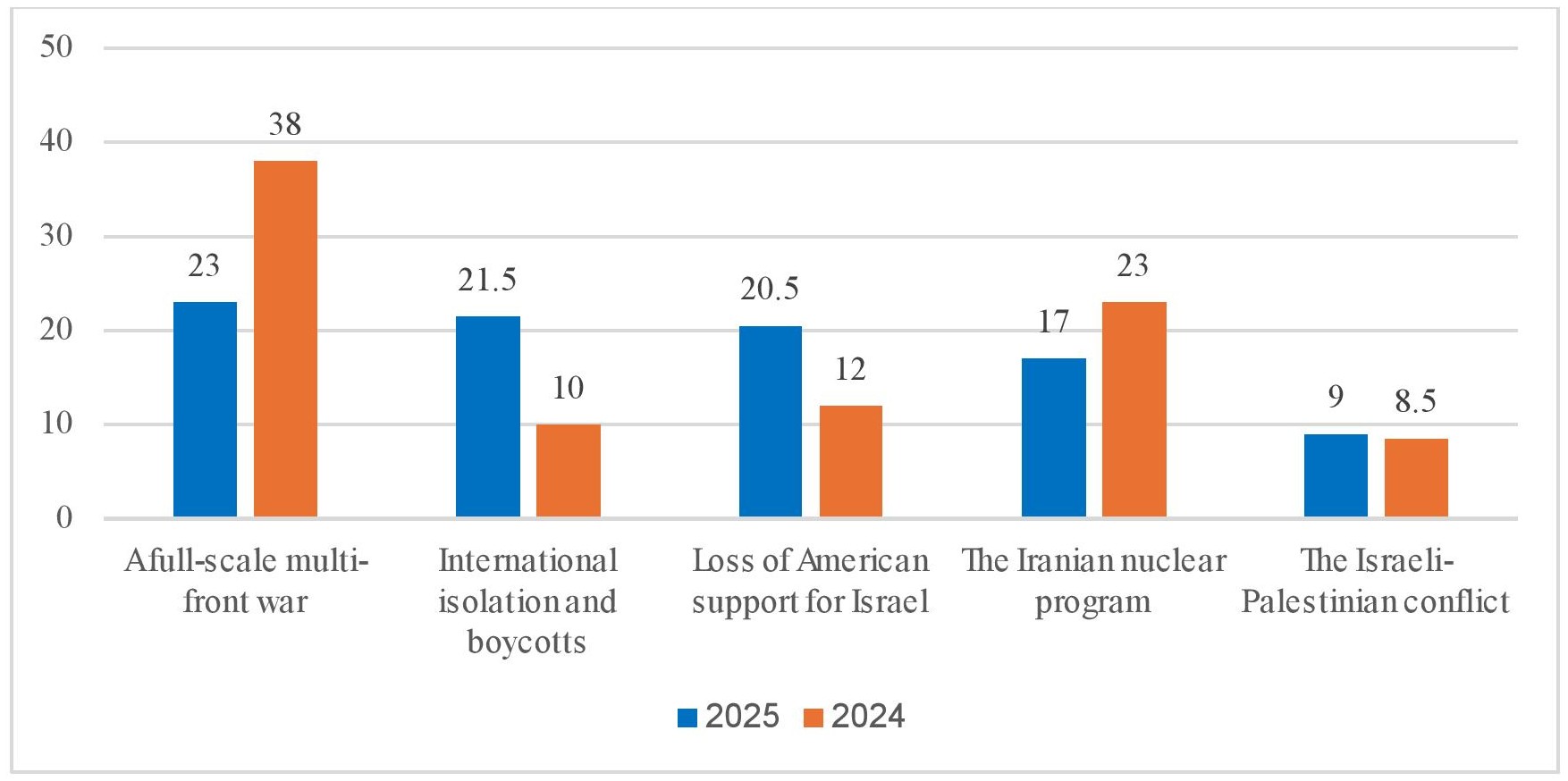 - A full-scale multi-front war is perceived by 23% of the general public (Jews, 22%; Arabs, 29%) as the most serious external threat to Israel, but there has been a significant decrease in this share compared to last year.