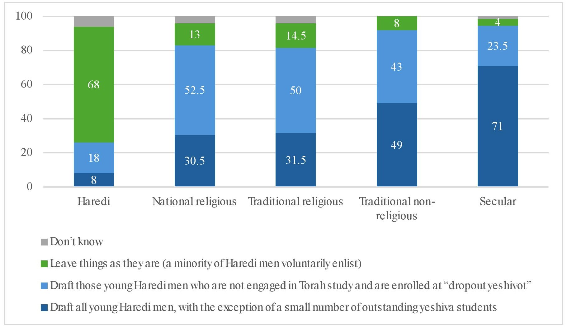 - Breaking down the Jewish sample by religiosity reveals that only the Haredim support leaving things as they are. A large majority of secular Jews, as well as about half of the traditional non-religious public, support the conscription of all young Haredi men, with the exception of a small number of outstanding yeshiva students. About half of the national religious and traditional religious publics support the conscription of young Haredim attending “dropout yeshivot,” and another third support the conscription of all young Haredi men.