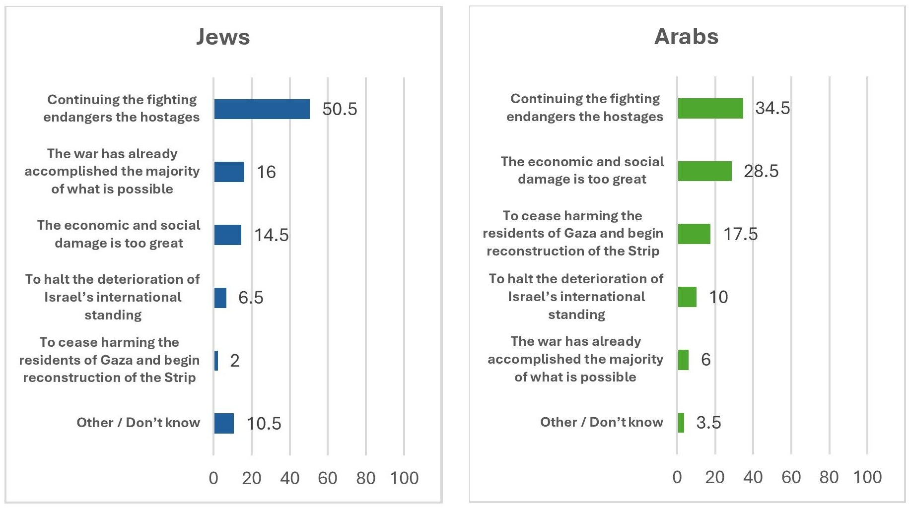 - About half of the Jews who said that the war should be ended gave the reason that continuing the fighting endangers the hostages, while among Arabs who think the war should be stopped, only about a third gave this as the main reason.