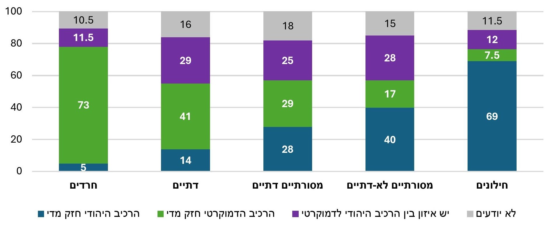 העמדה השכיחה בקרב המרואיינים היהודים היא שהרכיב היהודי במדינת ישראל חזק מדי (44%). כרבע (24%) סבורים שהרכיב הדמוקרטי חזק מדי; וכחמישית (19%) – שיש איזון בין שני הרכיבים. רוב ברור מהחילונים סבורים שהרכיב היהודי חזק מדי, בעוד רוב ברור מהחרדים סבורים שהרכיב הדמוקרטי חזק מדי.