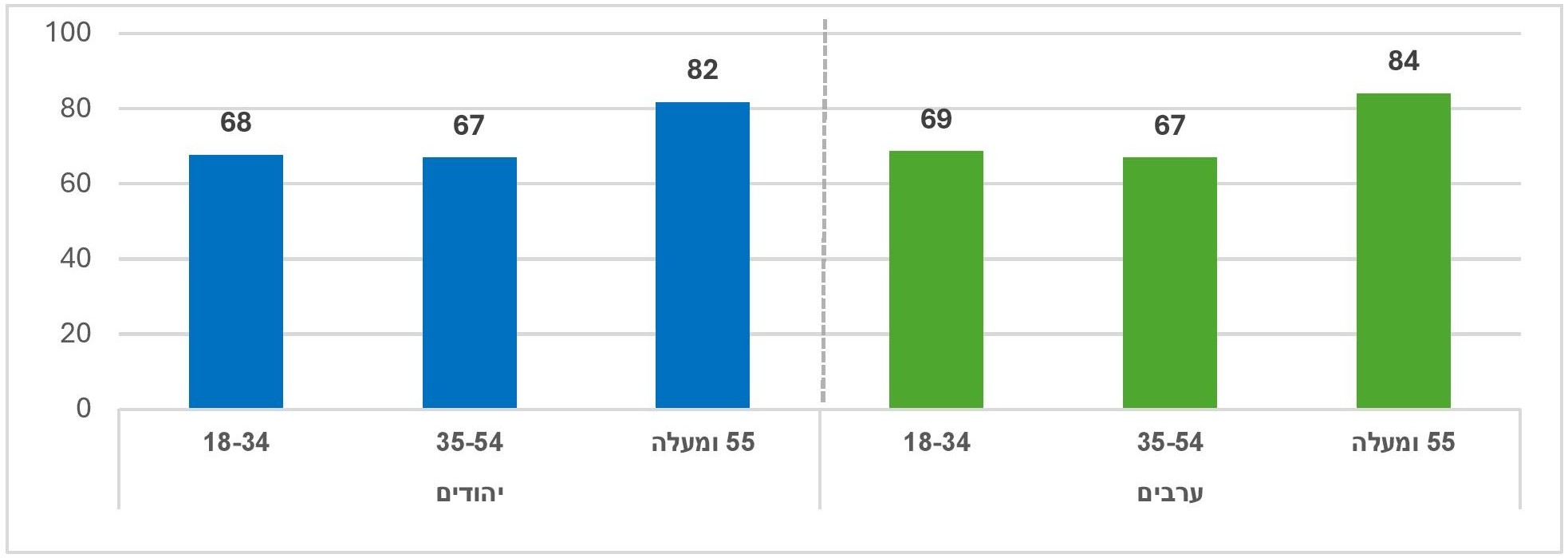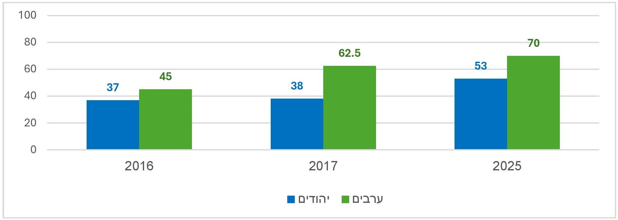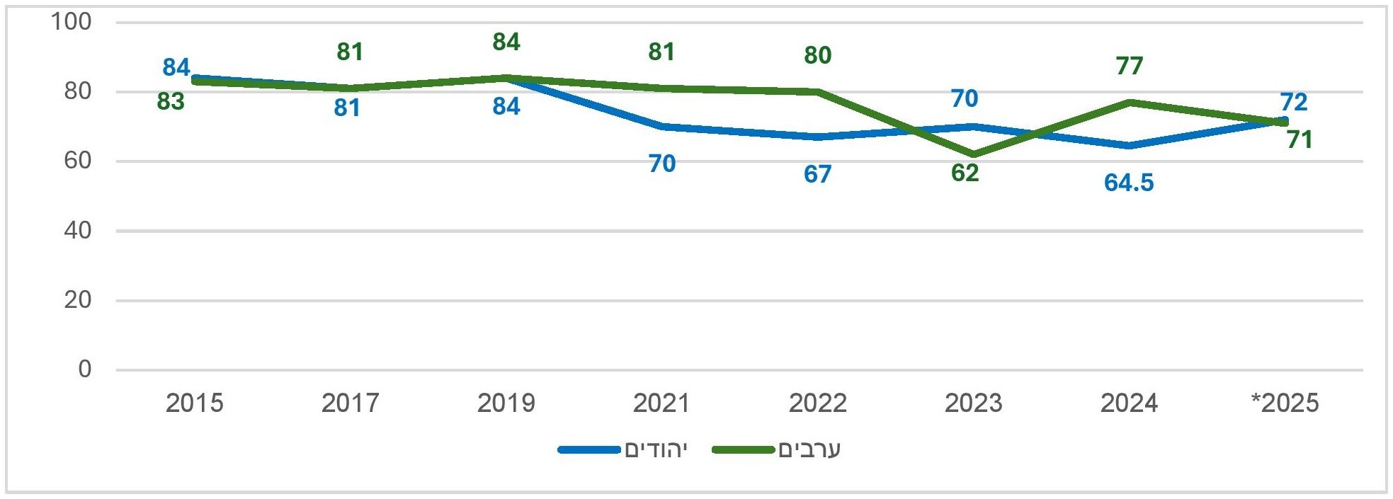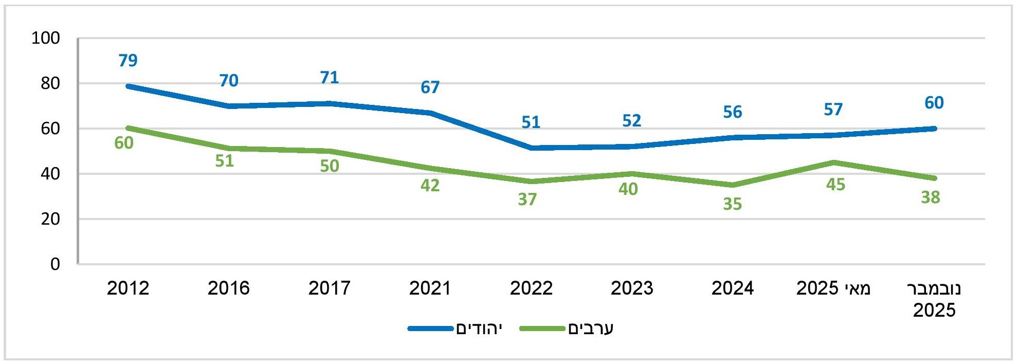 היהודים מעריכים את המצב כחיובי יותר מהערבים. שיעור היהודים המעריכים את המצב כרע בנובמבר 2025 עמד על 30.5%. מנגד, יותר ממחצית מהערבים עדיין מגדירים את מצבה של ישראל כרע (52%), אם כי מדובר בשיפור משמעותי לעומת מאי 2025, אז עמד שיעור זה על כמעט שני שלישים (64.5%).
