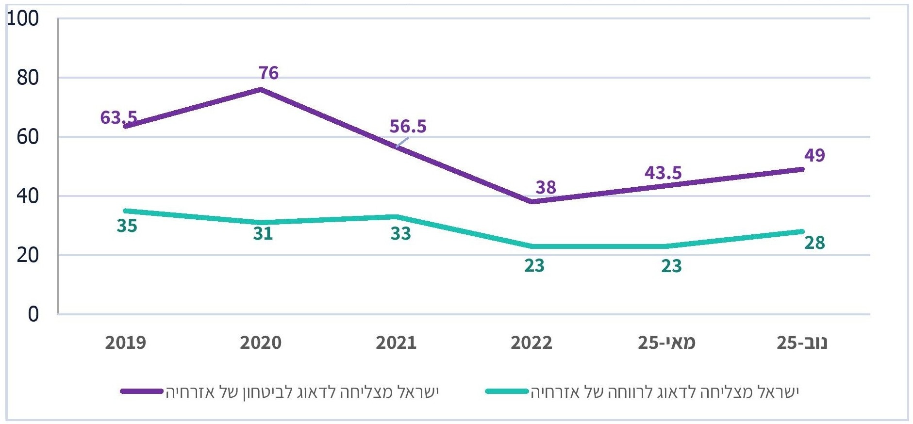למעלה ממחצית מהיהודים (53%) השיבו בנובמבר 2025 שהמדינה מצליחה לדאוג לביטחון אזרחיה, עלייה ניכרת בהשוואה למדידת מאי. זאת, לעומת כשליש בלבד מהערבים. הערכת הציבור את הצלחת המדינה לדאוג לרווחת אזרחיה נמוכה בהרבה: רק מעט למעלה מרבע (יהודים – 28%; ערבים – 27%) סבורים שהיא מצליחה בכך.