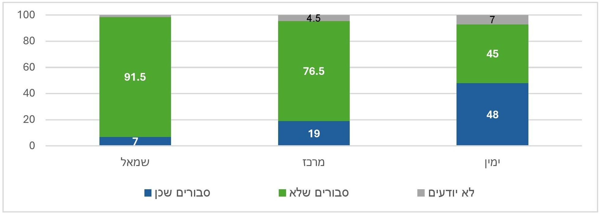 חלוקה לפי מחנות פוליטיים (מדגם היהודים) מעלה כי בשמאל 65.5% מעריכים את המצב כרע, לעומת 46.5% במרכז ו-16% בלבד בימין.