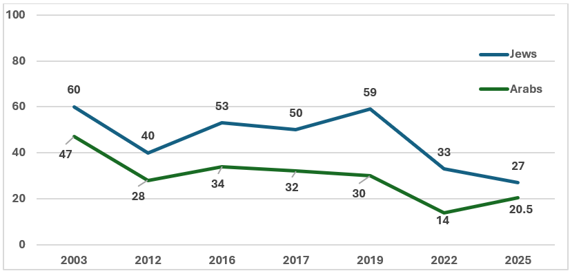 Agree that there is a political party in Israel that closely represents their views, 2003–2025 (%)