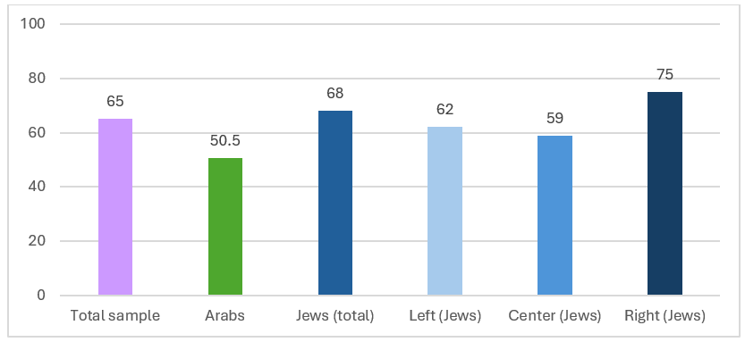 We asked, “Do you think the next Knesset elections will be fair and free?” A clear majority of the total sample (65%) responded in the affirmative. However, while a majority (68%) of Jews say that they expect the next elections to be free and fair, only about one-half (50.5%) of Arabs hold the same view. A breakdown of the Jewish sample by political orientation finds a majority in all three camps who think or are certain that the next elections will be free and fair, though this majority is particularly large on the Right.