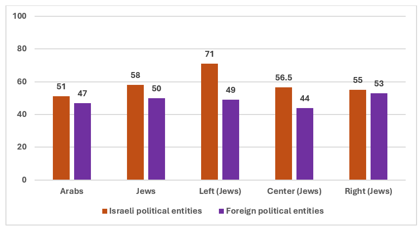 When it comes to the possibility of internal interference in the process, the Left is more suspicious than the Right and the Center (Jewish sample). On the other hand, regarding interference by foreign entities, the proportion of those who rate this as likely is highest on the Right and lowest in the Center, with the Left in between. In all three camps, there is greater concern about the prospect of interference by internal elements than by external actors.