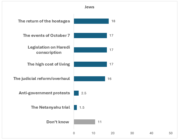 On this question as well, the largest share of Arab respondents (49%) reported that the cost of living is the most important issue for them when deciding who to vote for. Among Jews, five issues/events were selected by very close (16-18%) shares of respondents as the dominant factors in determining which party they would vote for: the return of the hostages, the events of October 7, legislation on Haredi conscription, the high cost of living, and the judicial reform/overhaul.