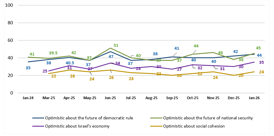 - This month saw a rise in optimism about the future for all four topics—democratic rule, national security, the economy, and social cohesion. The largest increase (7 percentage points) was in optimism about the future of national security, and the smallest (2 points), about the future of democratic rule. A review of findings over the past year shows (unsurprisingly) that optimism about the future of national security rose and fell more than optimism in the other three categories. As for the future of Israel’s economy, the share of optimists this month is the largest since we began measuring this topic.