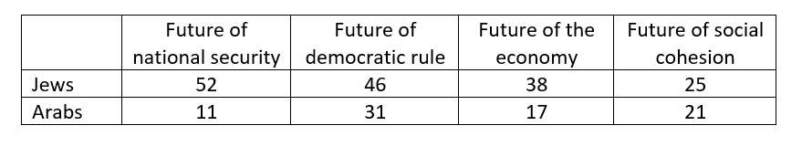 - As in previous months, the share of optimists among Jews is larger than that among Arabs on all topics, with the most surprising finding being the very large discrepancy in perspectives about the future of national security— the majority of Jews are optimistic (52%), compared with only a very small minority of Arabs (11%).