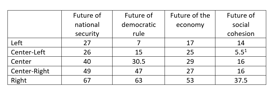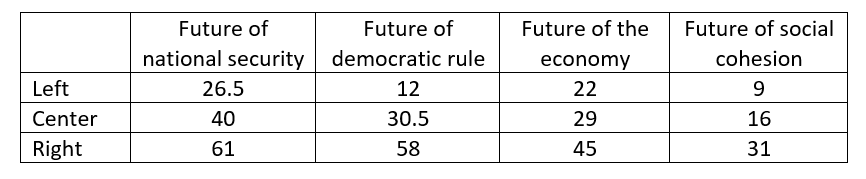 - A breakdown of findings by political orientation (Jews) reveals once again that the Left is the least optimistic camp, and the Right is the most optimistic. In fact, on the Left, there is no majority of optimists in any of the four areas, while on the Right, we found a clear majority of optimists regarding the future of national security and the future of democratic rule.