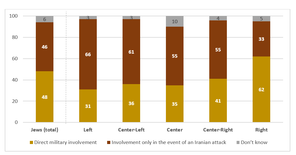 - However, even in this case, when we divide the Jewish sample into five categories of political orientation, we find that only among those fully on the Right is there a majority who support direct Israeli participation in an attack on Iran, while in all other categories, including the Center-Right, the majority support participation only in the event of an Iranian attack on Israel.