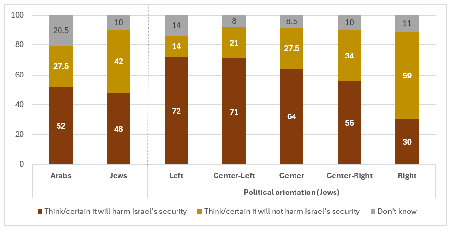- Among both Jews and Arabs, a greater proportion think that this step will harm Israel’s security than hold the opposite view (Jews: 48% vs. 42%, respectively; Arabs: 52% vs. 27.5%, respectively).