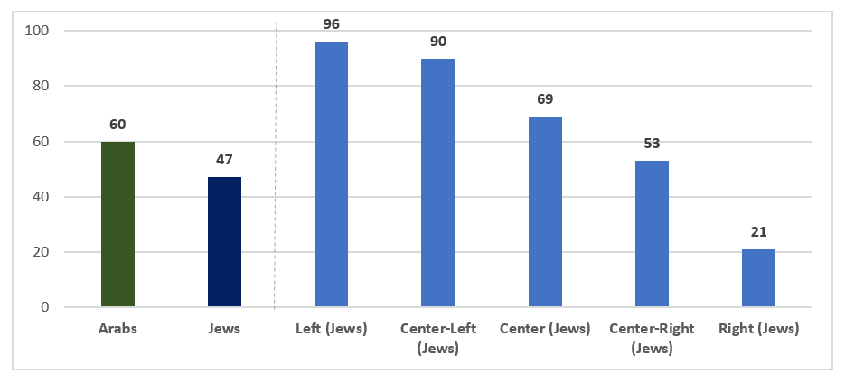 - Analyzing the Jewish sample by three political camps reveals that those on the Left and in the Center agree with Barak to a very large degree (92.5% and 69%, respectively), while on the Right, only a minority agree (31%). However, when dividing the Jewish sample into five political camps, we find that even on the Center-Right, the majority agree with Barak, and only among those fully on the Right do the majority (74%) disagree with him. Here, too, the line of separation runs between those fully on the Right and the rest of the Jewish public.