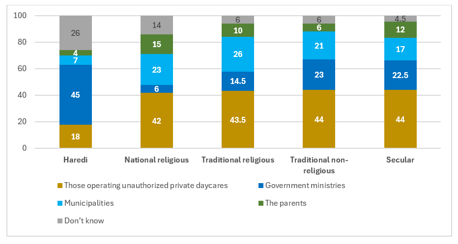 - While over 40% of secular, traditional, and national religious Jews attributed the main responsibility to the operators of the daycares, followed by government ministries or municipalities, among Haredim the picture is completely different: the largest share (45%) think that government ministries are mainly responsible. Only a minority of Haredim (18%) blame the operators of daycares. Also striking is the large proportion of Haredim who selected the “don’t know” response, and the small proportion who blame the parents.