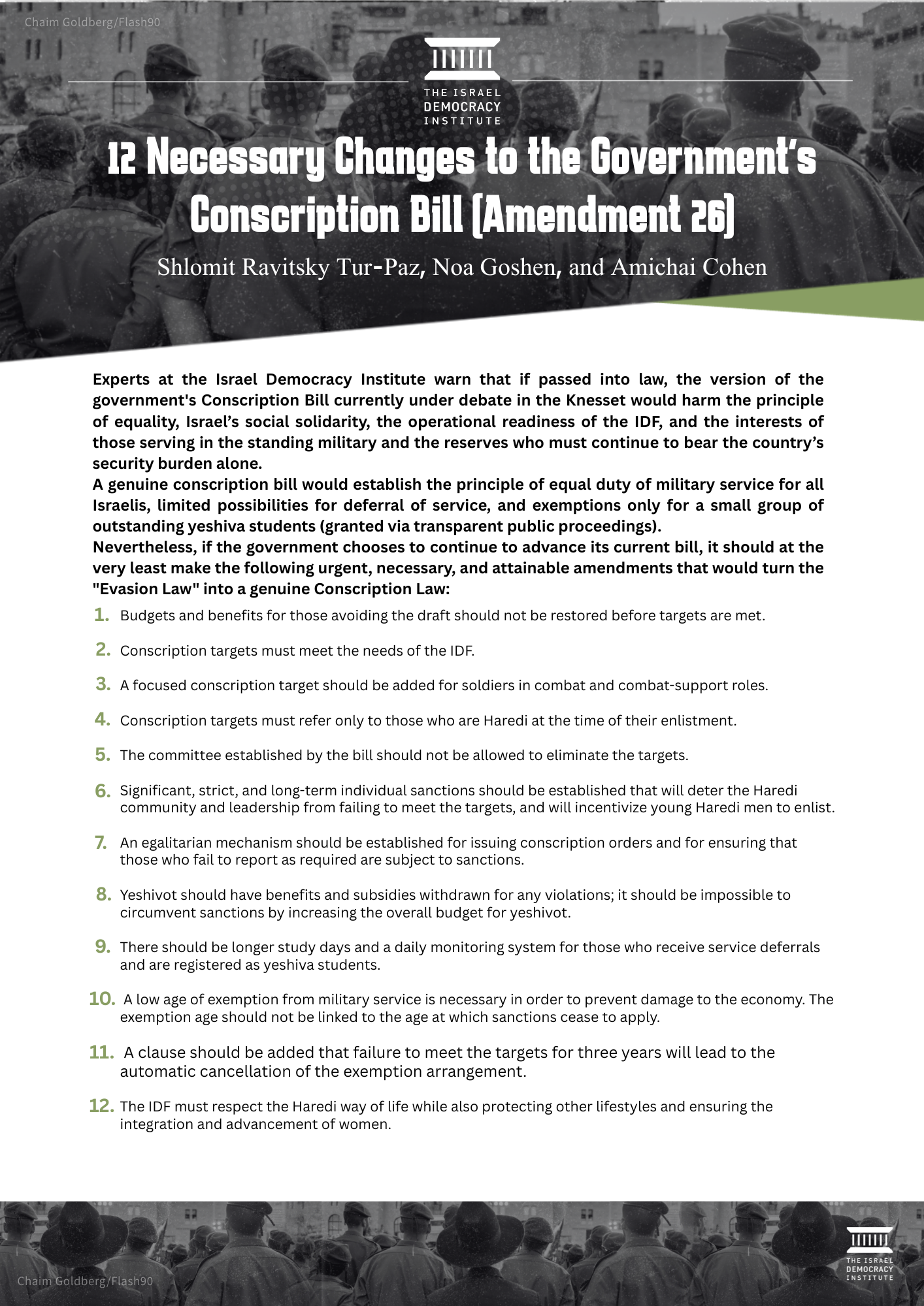 IDI experts argue for a universal obligation to serve, as opposed to the model of the latest "conscription" bill, which would be harmful to Israel's security and social solidarity. However, if the present legislation does move forward, the points presented here would mitigate the harm in the proposed bill.