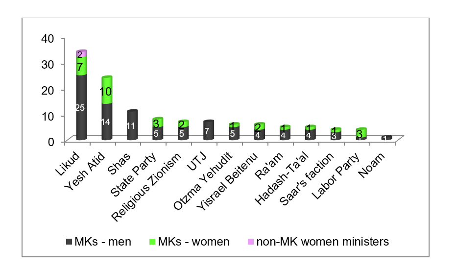 The impressive improvement in women's representation in the Knesset that was seen between 1999 and 2015 has halted in the past decade. This is true in government as well, where the representation of women is actually regressing rather than improving compared to the previous government, and is particularly low compared to other democracies.