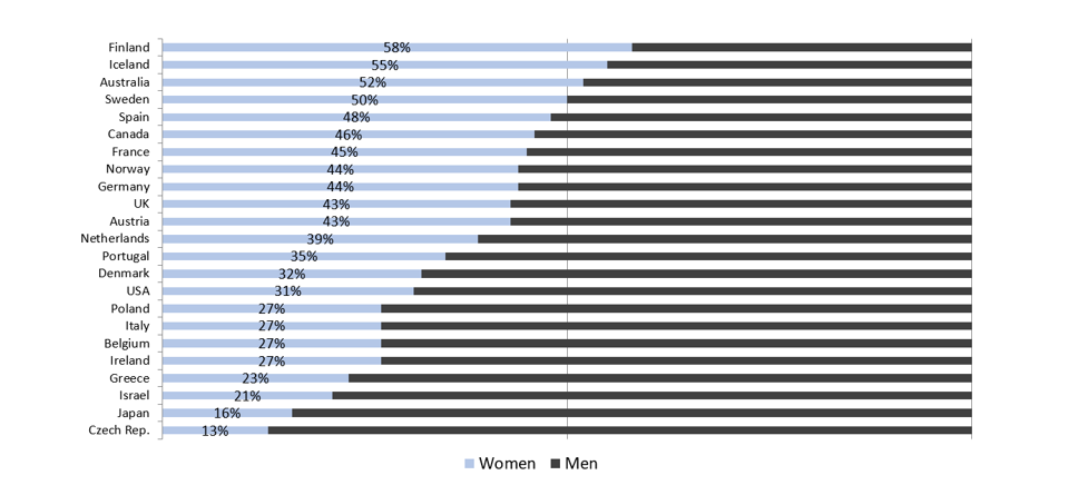 Furthermore, even if there has been an improvement in the number of women in Israeli governments, the change has been slower than that in many democracies. In some, not only has the number of women increased, but there are also instances of gender parity or even a female majority in the government. As can be seen in the figure below, the current governments of Finland, Iceland, and Australia have a female majority. In Canada, Sweden, and Spain, their number is equal or almost equal to that of male ministers. In contrast, there are countries where the government remain mostly men: in the Czech Republic, only 13% of government members are women, and in Japan - only 16% (though there is currently a woman serving as prime minister).