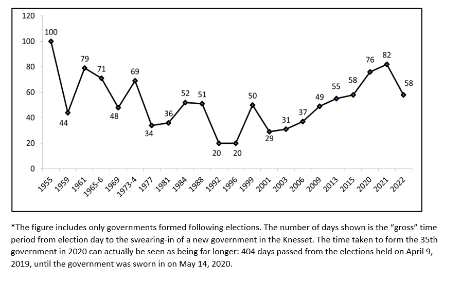 Figure 1 below shows that the process of forming a government during the first two decades of the State of Israel took longer than today, largely because in those days, the process was not limited in time. In 1955, no fewer than 100 days passed between the elections for the third Knesset and the swearing-in of the new government, and in 1961, it took 79 days from the elections for the fifth Knesset until the new government was sworn in. Subsequently, the time taken became much shorter, but since 2001, these periods have become longer again. It should be noted that the numbers given are the “gross” number of days, that is, the time that passed between election day and the swearing-in of the government. If we subtract the number of days between the elections and the time at which the President formally charged a particular candidate with the task of forming a government, then these periods are a bit shorter.