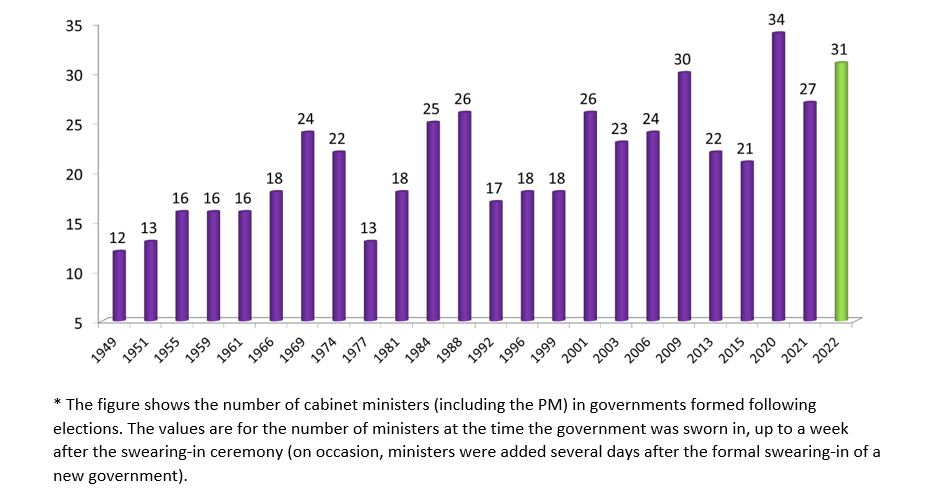 The total number of cabinet members (the prime minister and the ministers) serving in the government has risen considerably over the years (see Figure 2 below). The first government, sworn in in 1949, included only 12 members. In all the governments up to 1966, there were no more than 18 ministers. A sharp rise in the number of ministers came with the government formed following the 1969 elections, mainly due to this being a broad coalition comprising the two large factions – the left-wing Alignment faction and the right-wing Gahal faction. This government, which was considered a national unity government, included 24 members. The national unity governments of the 1980s also had inflated ranks of ministers.