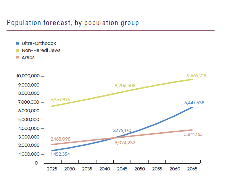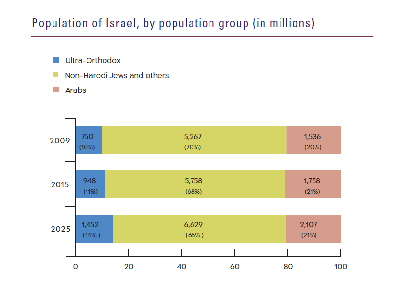 The growth rate of the ultra-Orthodox (Haredi) population in Israel is the highest of any of the populations in developed countries, at around 4.2% per year. The factors underlying this particularly rapid growth are high fertility rates, modern standards of living and medicine, a young average age at marriage, and large numbers of children per family. Consequently, the ultra-Orthodox population in Israel is very young, with 57% under the age of 20, compared with 31% of the country’s general population. In 2025, the Haredi population numbered around 1,452,350, up from 750,000 in 2009, and constituting 14.3% of Israel's total population. According to Central Bureau of Statistics (CBS) forecasts, its relative size is expected to reach 16% in 2030, and it will number two million people in 2033.