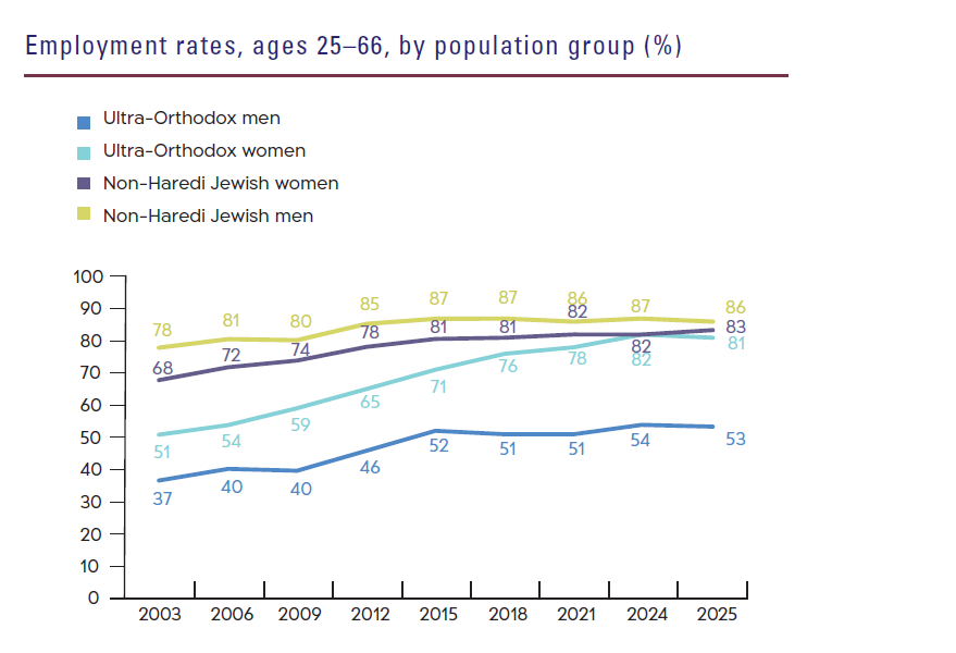 One of the main topics of public debate regarding the place of the ultra-Orthodox community in Israeli society is employment. In 2002, around one-third of ultra-Orthodox men were employed, and just over half of ultra-Orthodox women. Between 2003 and 2015 there was a major surge in ultra-Orthodox employment rates for both men and women, resulting from a combination of economic need in the community and of public policy designed to promote entry of ultra-Orthodox Israelis to the labor market by various means. As a result, more than half of ultra-Orthodox men (54%) and more than threequarters of ultra-Orthodox women (81%) are now employed. However, the rise in employment rates among men has come to a halt in recent years (2016–2025).
