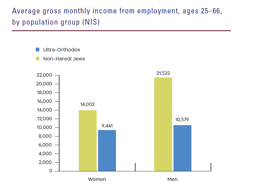 The average income of ultra-Orthodox employees is just 56% of that of other Jewish workers. Among other factors, this difference can be attributed to the fewer weekly hours worked by ultra-Orthodox workers and lower compensation, which is a result of limited vocational training and concentration of these workers in lower-paying occupations.