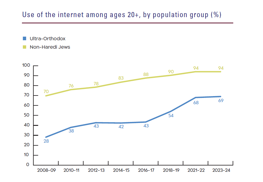 Beyond military matters, we see promising trends in the use of technology. The gaps in internet usage between the ultra-Orthodox and the rest of the Israeli public have narrowed, with 69% of the ultra-Orthodox and 94% of other Jews reporting that they are regular internet users.