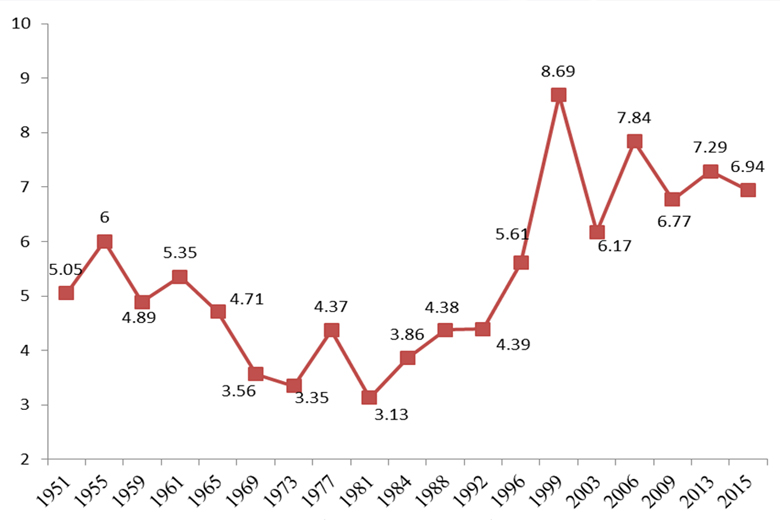 שיעור המושבים המשותף של המפלגות המצרפיות הגדולות (באחוזים), ממוצעים לפי עשורחישובי המחברים בהתבסס על תוצאות בחירות, כפי שהן מופיעות אצלMackie and Rose, 1991; Nordsieck, 2015